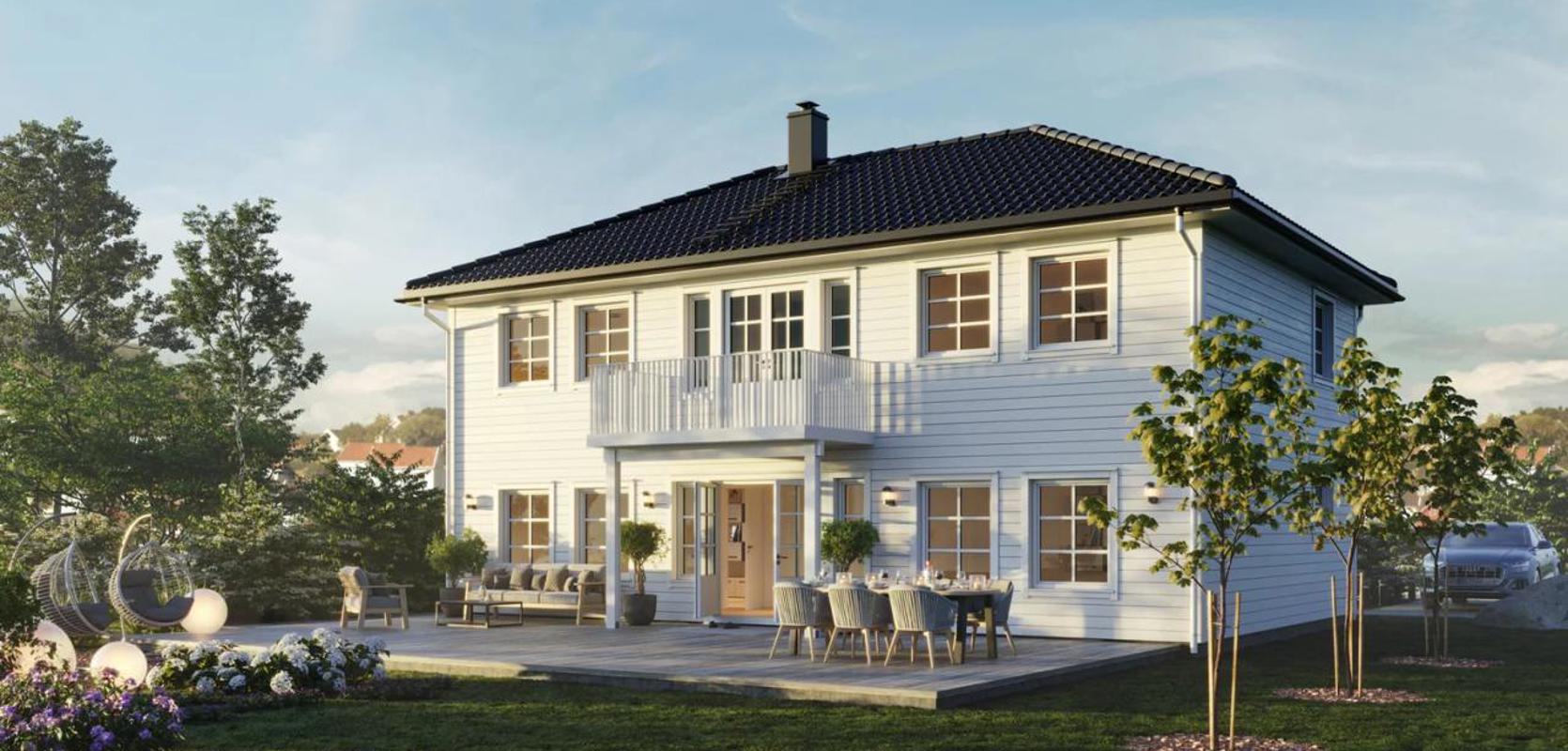Med et nydelig inngangsparti, en romslig hall, doble dører rett gjennom huset og ut til hagen, valmet tak og flott balkong, fremstår Mesterhus Karita som en klassisk perle.