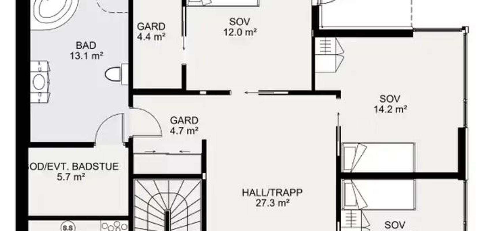 Inngangspartiet er strategisk plassert på øvre plan, noe som gjør huset tilgjengelig for alle livsfaser. Her vil du finne hovedsoverommet med en privat garderobe, eget bad i tilknytning til soverommet, et praktisk vaskerom med egen utgang, og et romslig kjøkken- og stueområde med en åpen planløsning. Den skrå himlingen og de store vinduene i det store oppholdsrommet gjør dette til et fantastisk rom.
