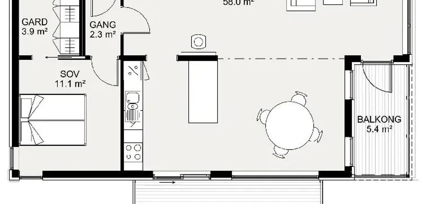 Inkludert er egen carport, tre komfortable soverom, to balkonger, en innbydende åpen stue- og kjøkkenløsning, to bad og separat vaskerom. Boligen er tilpasset flat tomt, og kan også kjedes for større feltutbygginger.