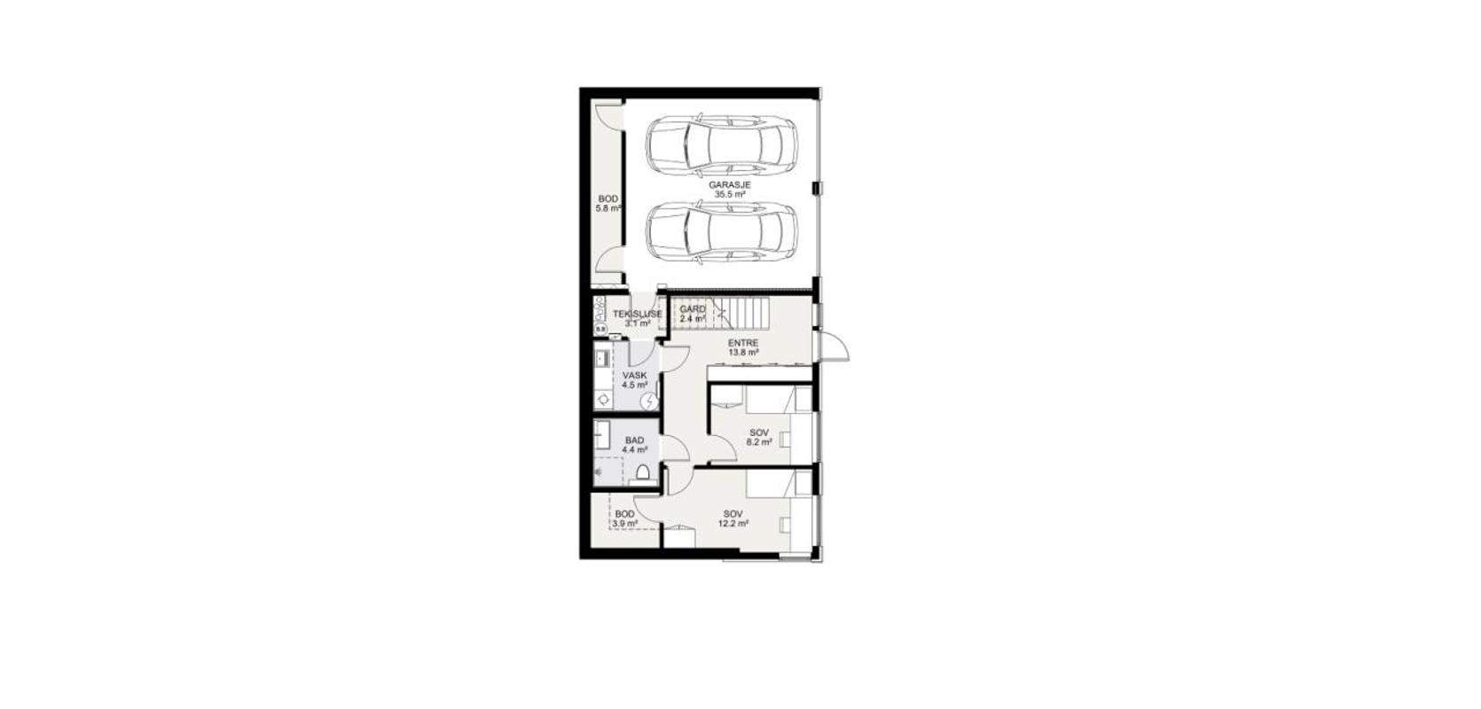 Funkis kommer jo fra ideen om at form og funksjon følger hverandre. Integrert i huset er det en dobbeltgarasje på 36 kvadratmeter. I bakkant av garasjen er det en bod med to innganger, hendig til lagring av gressklipper, hagesakser, dekk, verktøy og annet utstyr som trengs til bilene og på grunnplanet. Fra garasjen kan du gå rett inn i huset via vaskerommet, og alle som har hund eller barn vet hvor praktisk det kan være.